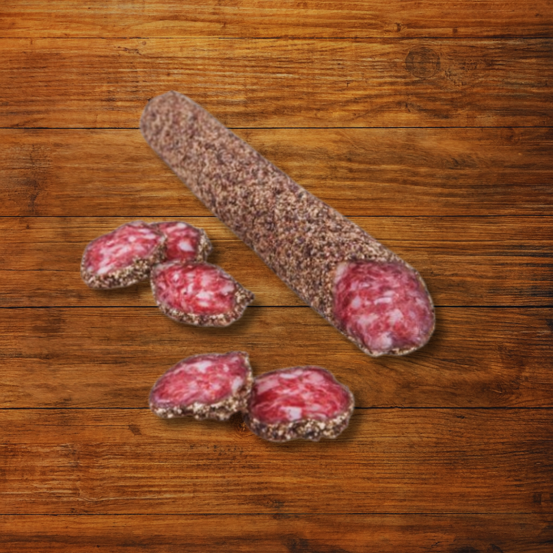 Desde el corazón de Granada llega un embutido que guarda la esencia de la tradición. Elaborado en Montejícar, un pueblo donde la charcutería artesanal es un arte que pasa de generación en generación, este salchichón a la pimienta conquista con su sabor auténtico y su aroma inconfundible.